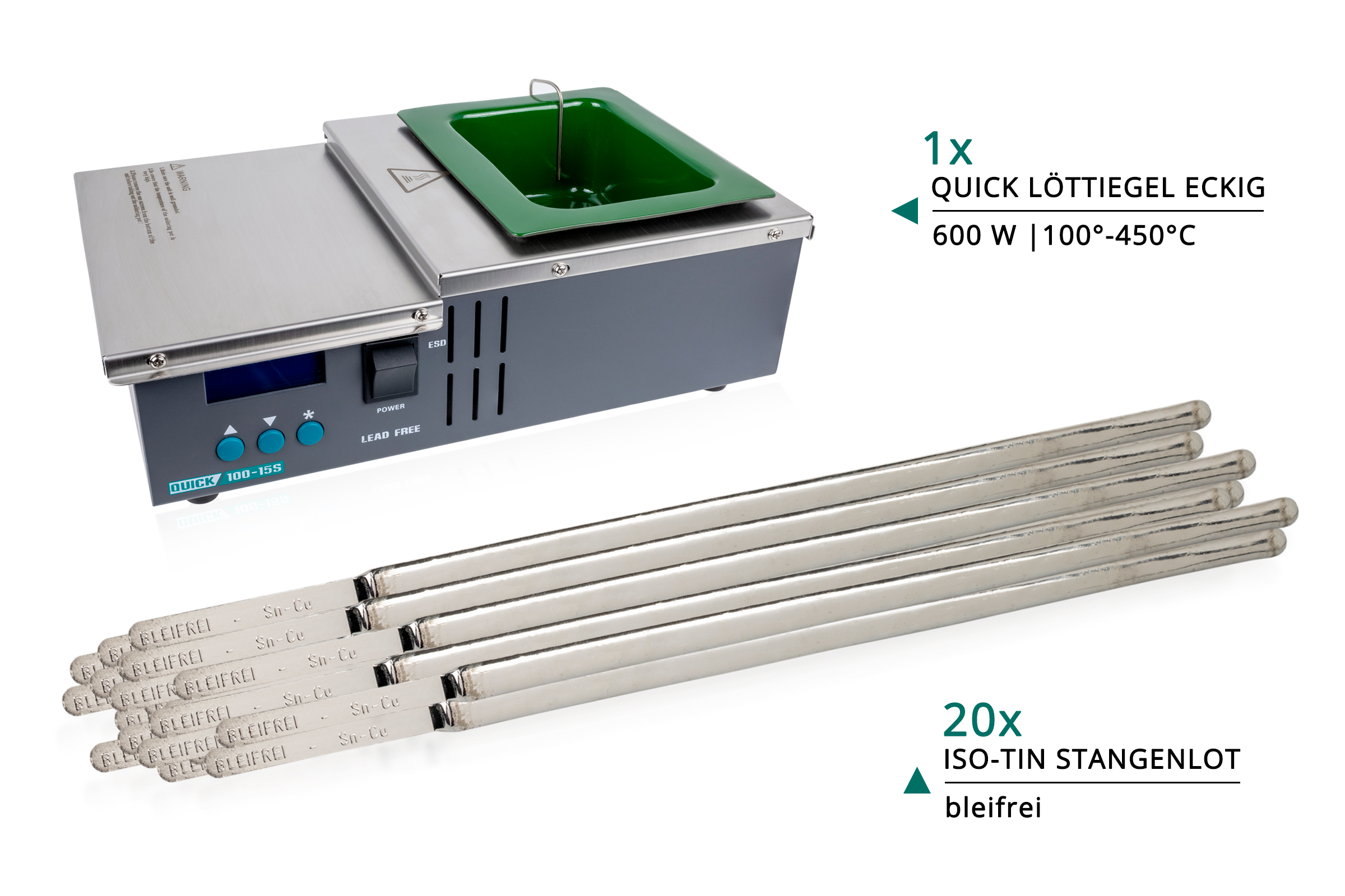 QUICK soldering pot, round, Ø36mm, 40mm deep, 150°-500°C, 200W 55,00 € incl. VAT zzgl. Versandkosten Add to cart QUICK soldering pot, square, 98 x 121 mm, 58 mm deep, 100°-450°C, 600 W 259,00 € incl. VAT zzgl. Versandkosten Add to cart QUICK soldering pot, round, Ø54mm, 38mm deep, 150°-450°C, 400W 87,70 € incl. VAT zzgl. Versandkosten Add to cart (Deutsch) Effektive Lötbad-Regeneration mit GALLUNOPTIMAL by FELDER – Sn99,9P Pellets, 250 g 43,38 € incl. VAT zzgl. Versandkosten Add to cart ERSA Longlife thermocouple for RA4500D control station 195,74 € incl. VAT zzgl. Versandkosten Add to cart ERSA thermocouple for RA4500D control station 87,34 € incl. VAT zzgl. Versandkosten Add to cart (Deutsch) i-Solder-Pot 80x10mm, 10mm tief für ERSA i-Tool 206,96 € incl. VAT zzgl. Versandkosten Add to cart (Deutsch) Verzinnungsset mit Löttiegel eckig, 98x 121mm, 58mm tief 458,00 € incl. VAT zzgl. Versandkosten Add to cart