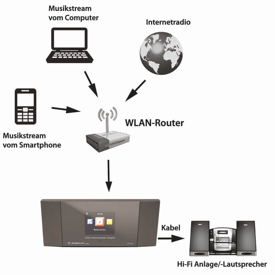 The ALBRECHT DR 463 is a wireless LAN adapter for DAB+/Internet/FM radio reception. It receives over 25,000 Internet radio stations worldwide with a WLAN router, including 288 DAB stations in Germany. In addition, music data can be transferred from a PC or smartphone to the stereo system.