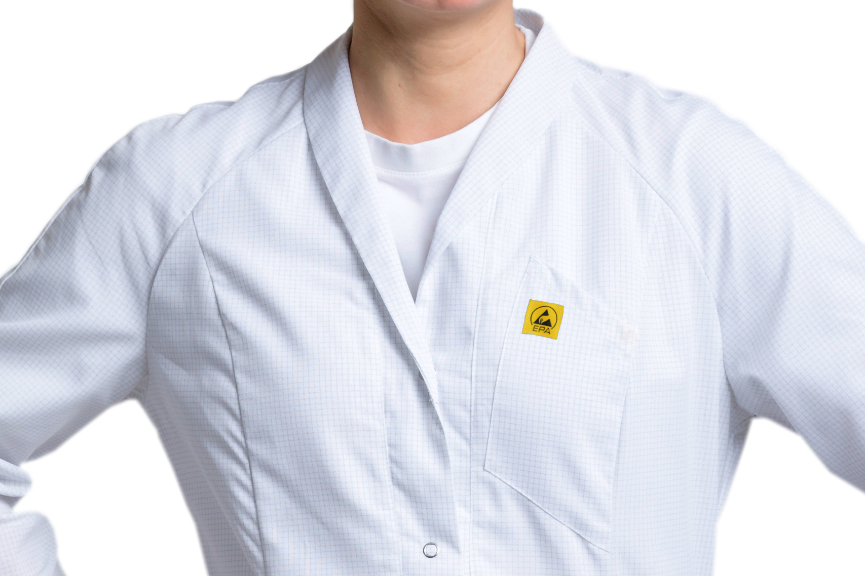 ESD women’s short work coat with shawl collar and fashionable raglan sleeves, figure-hugging dividing seams at the front and back, with EPA test report, made from particularly lightweight and durable fabric, with 3 patch pockets, some of which are slanted, and EPA logo.