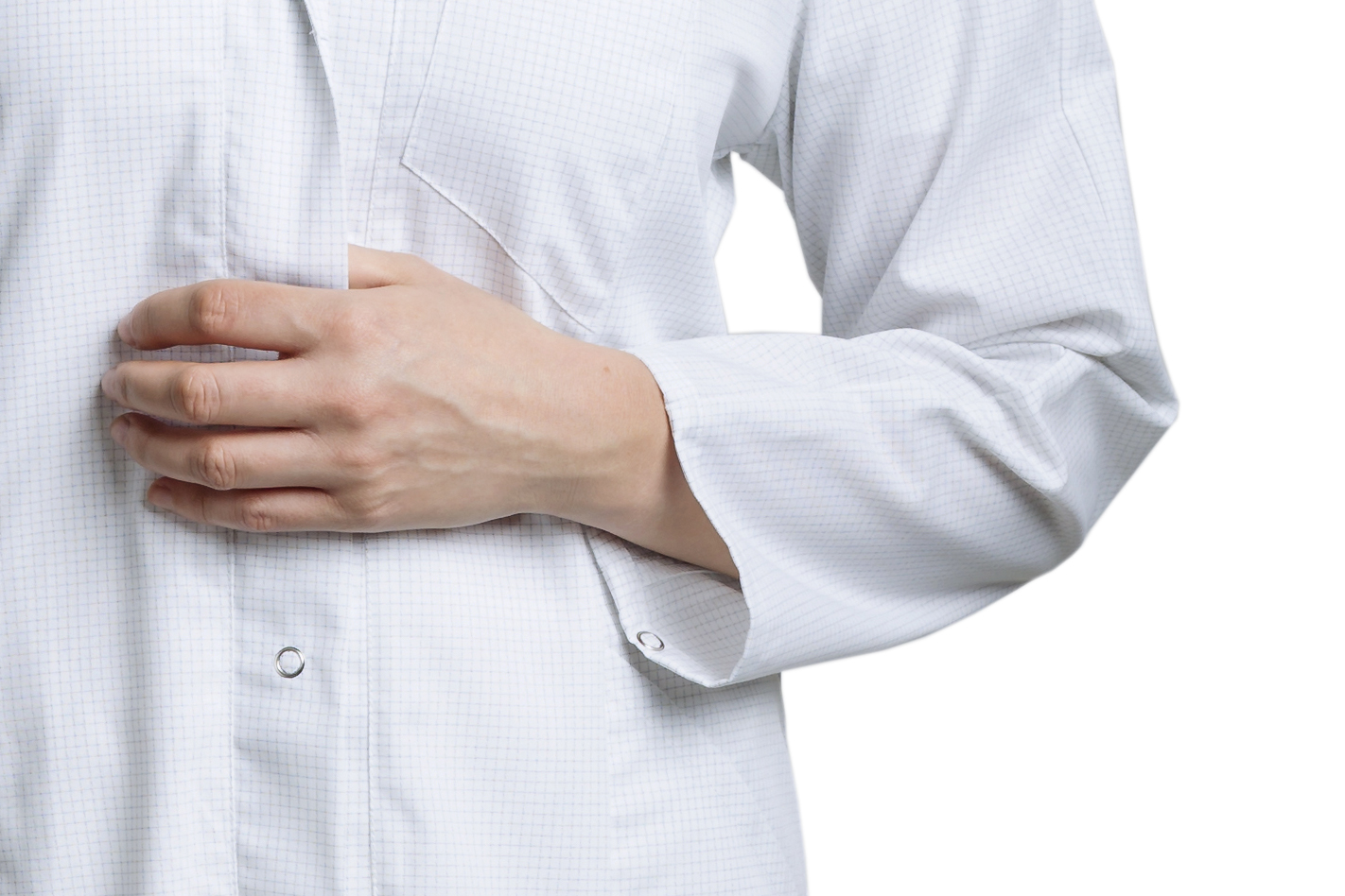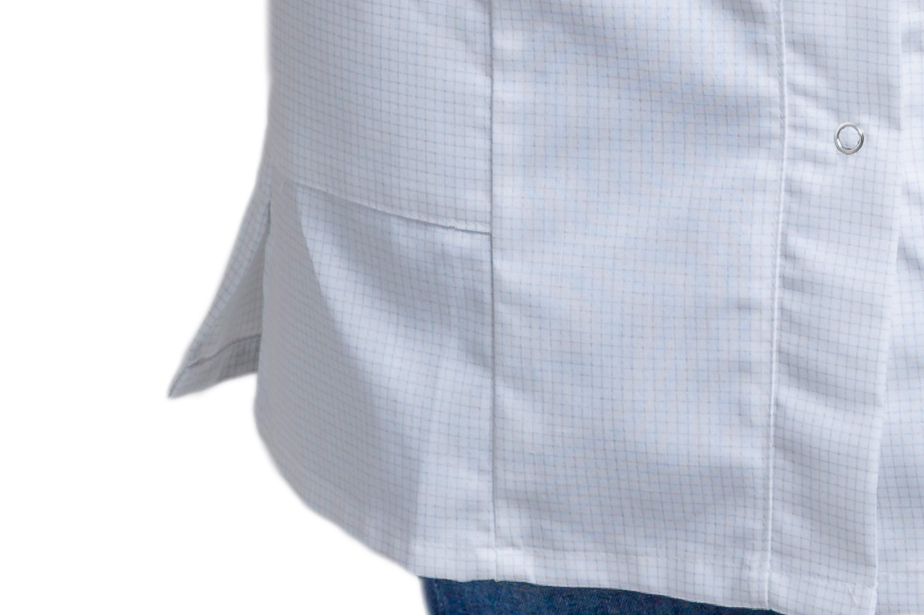 Visible snap fastener placket at the front and adjustable sleeve width with snap fasteners and comfortable walking slits in the side seams.