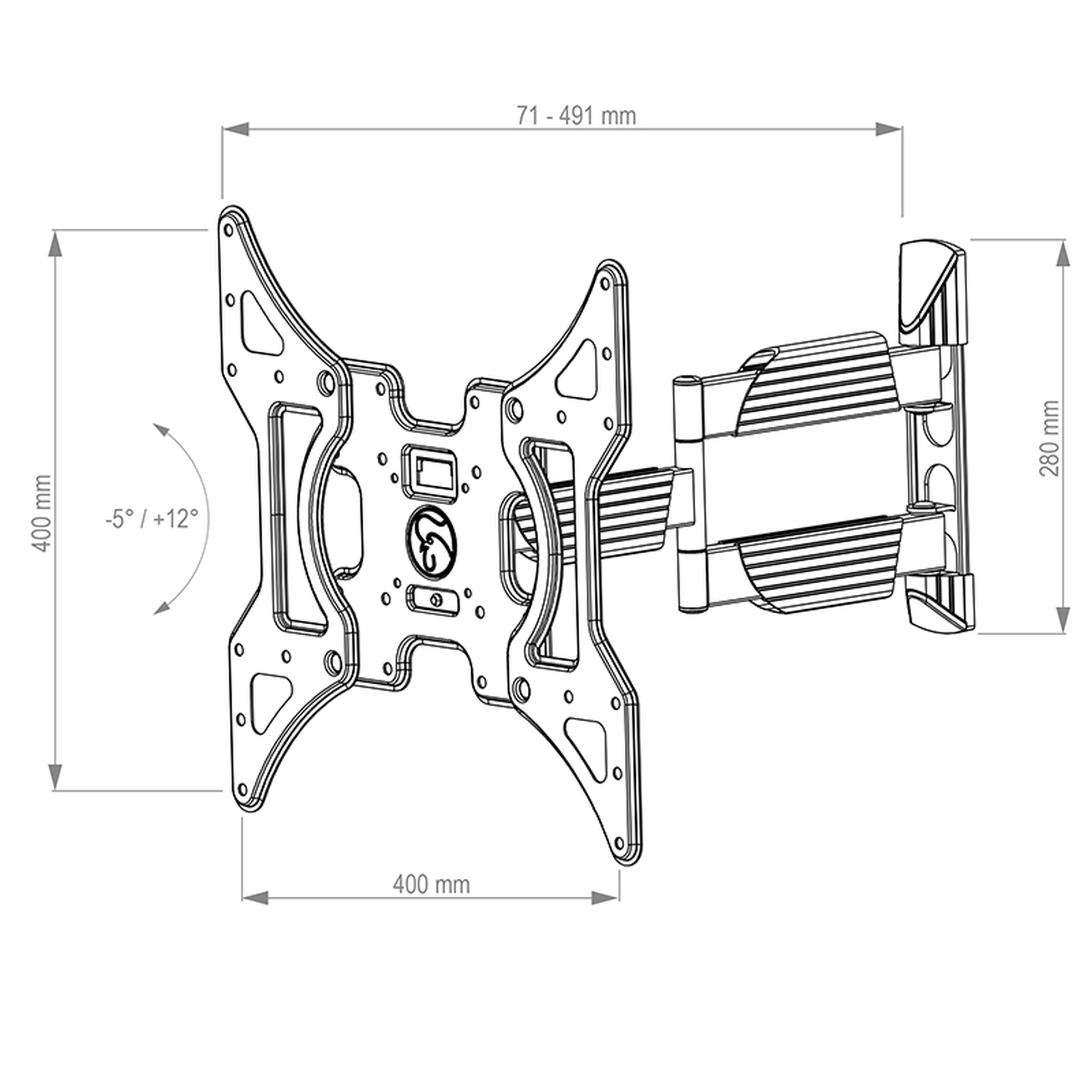 The BrackIT M is a fully movable wall mount for screens measuring 43–50 inches | 109–127 cm. The VESA mount covers the universal VESA standards 100 x 100 mm and 400 x 400 mm and allows the screen to be mounted in either landscape or portrait orientation. The screen tilt can be adjusted between -5° and +12° on the mounting side. Thanks to the swivel joint, the wall distance can be adjusted between a minimum of 71 mm and a maximum of 491 mm. In addition, the mount can be swiveled by a maximum of ± 90°. The exact angle depends on the width of the mounted screen. The cabling is held together by a cable clip. The maximum load capacity is 30 kg. The surfaces are protected by a solvent-free, impact- and scratch-resistant powder coating in black.