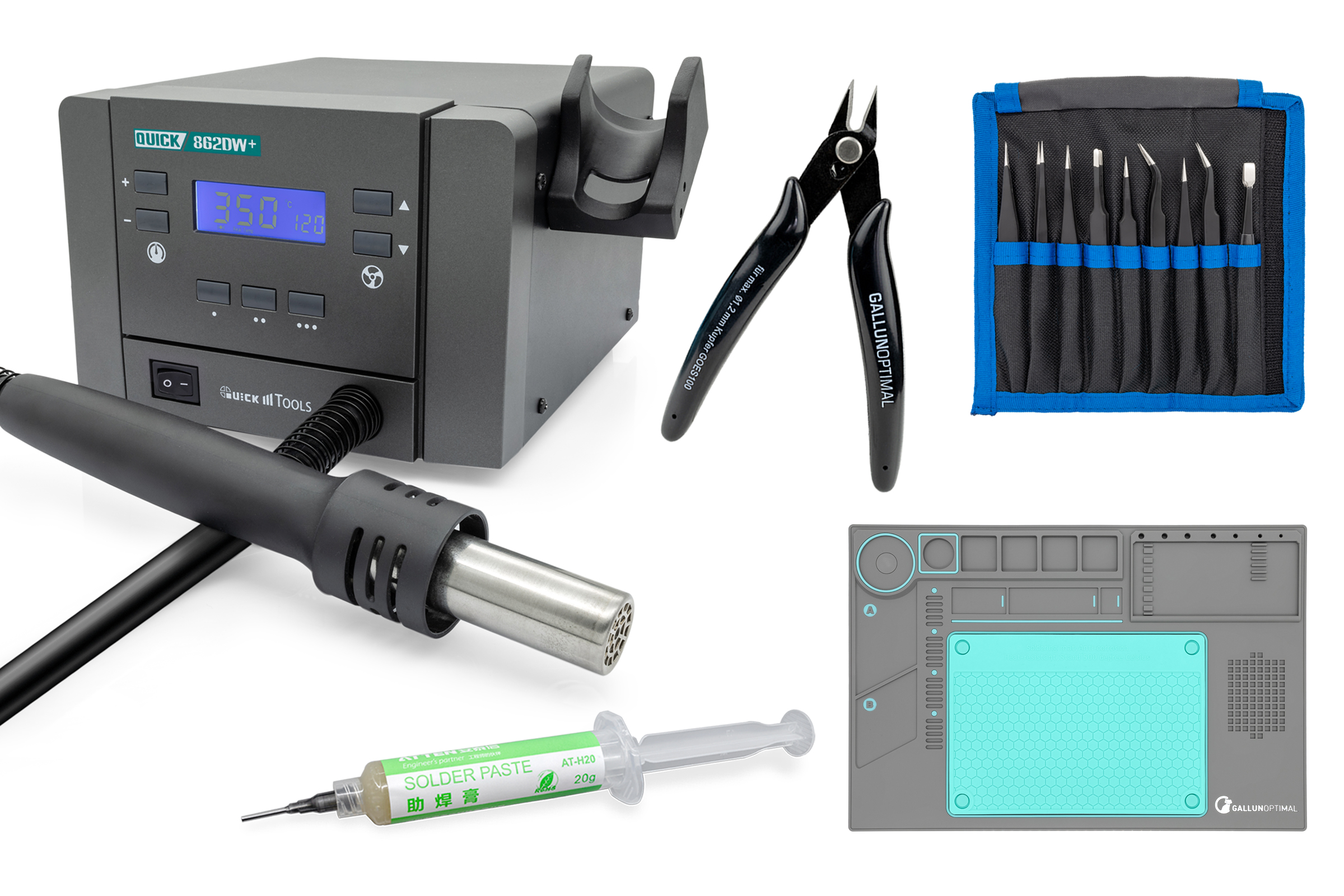 QUICK Heißluft-Reworkstation digital 1000W, 230V, 50 L/min., +100 bis +500°C mit 4-teiligem Zubehör-Set