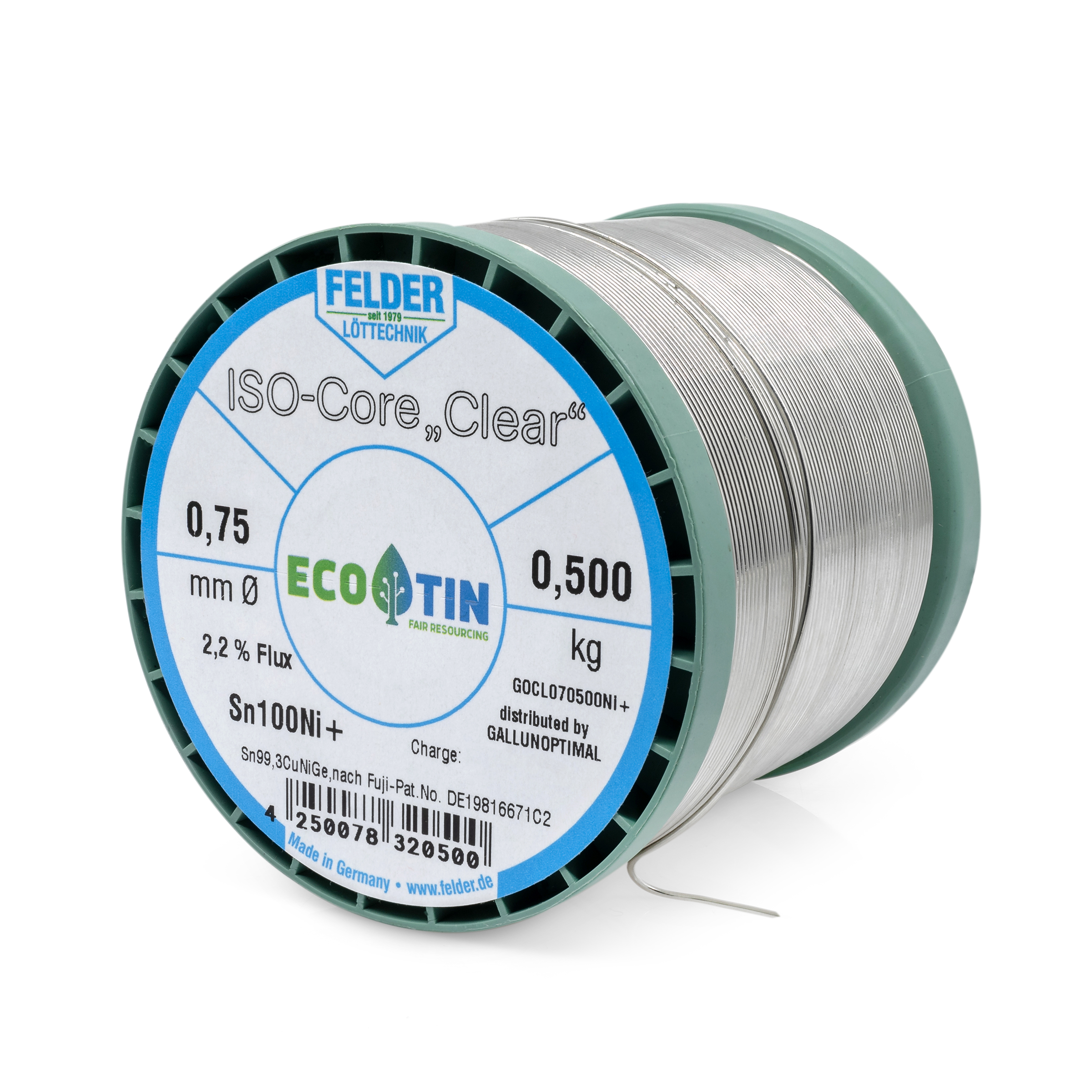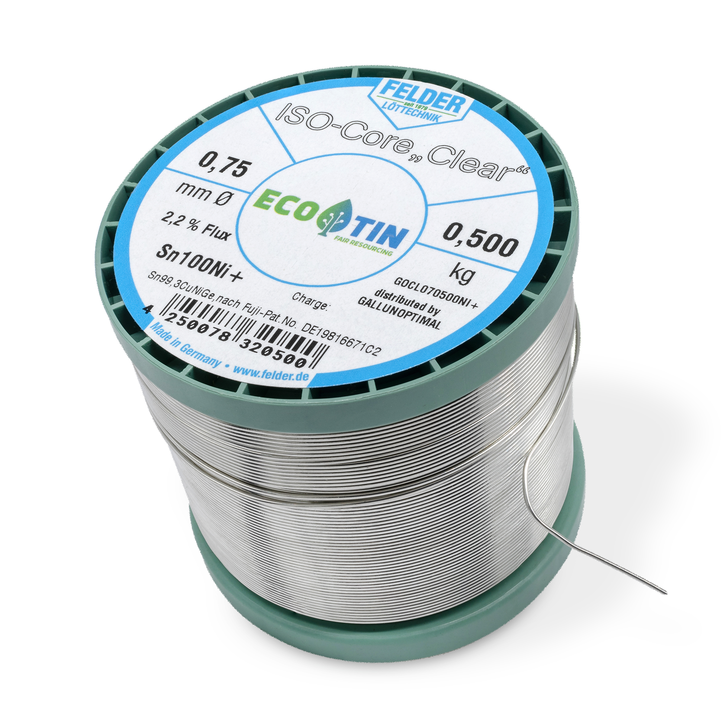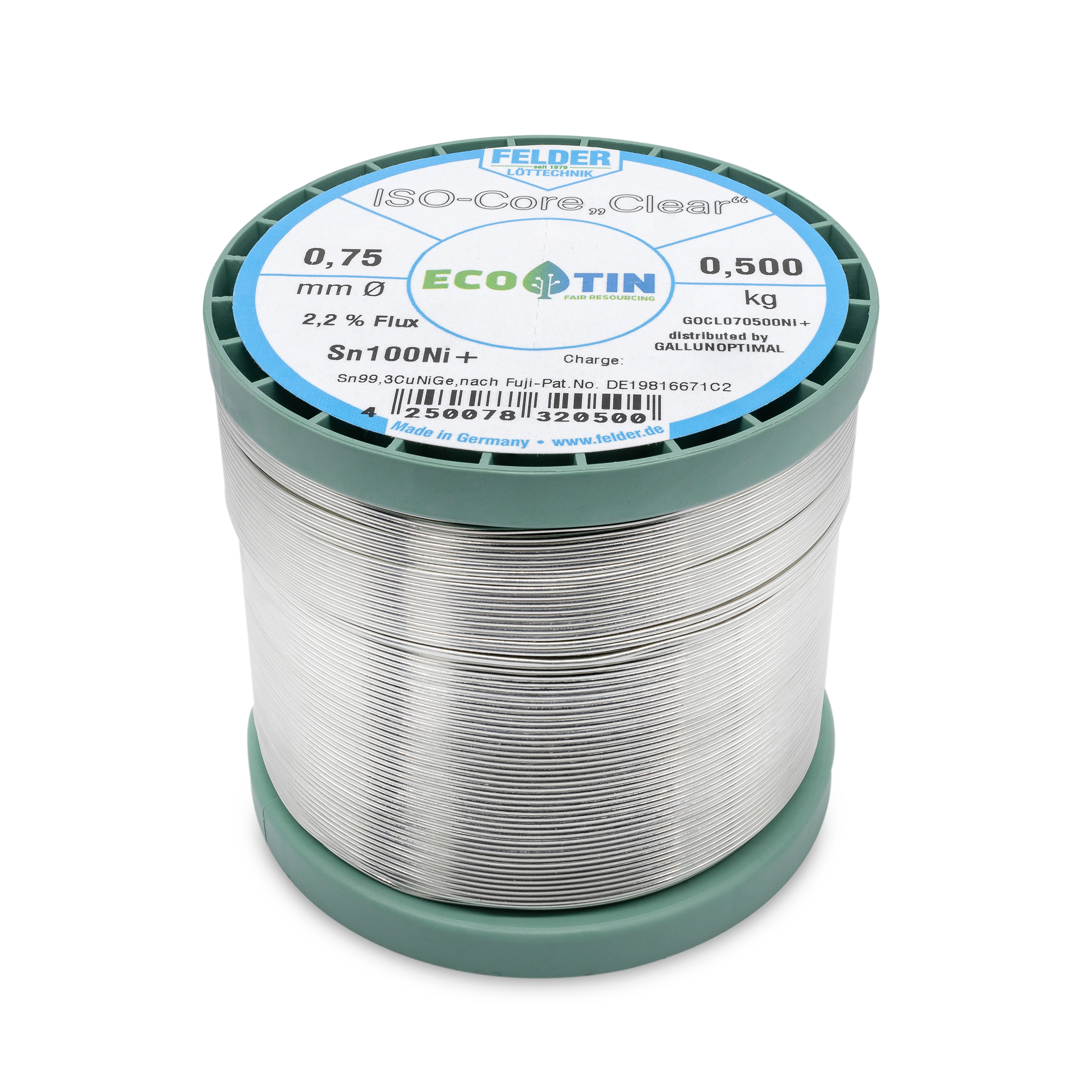 ISO-Core solder wire Sn100Ni+, Sn99.3CuNiGe, according to Fuji patent no. DE19816671C2, melting point 227°C, with 2.2% flux content Clear according to DIN EN 29454/1.1.3.B REL1 (F-SW32) 0.7 mm on 500 g spool