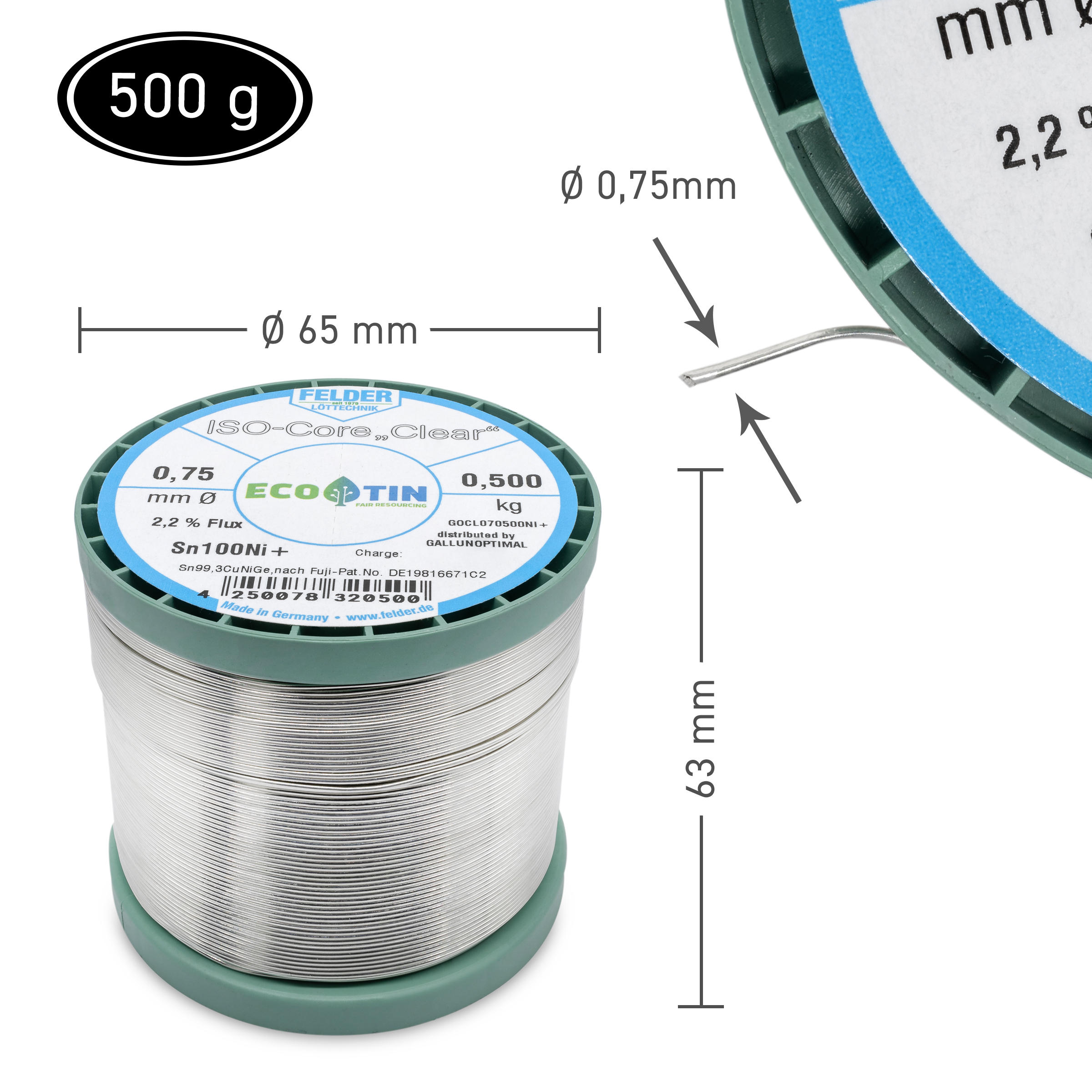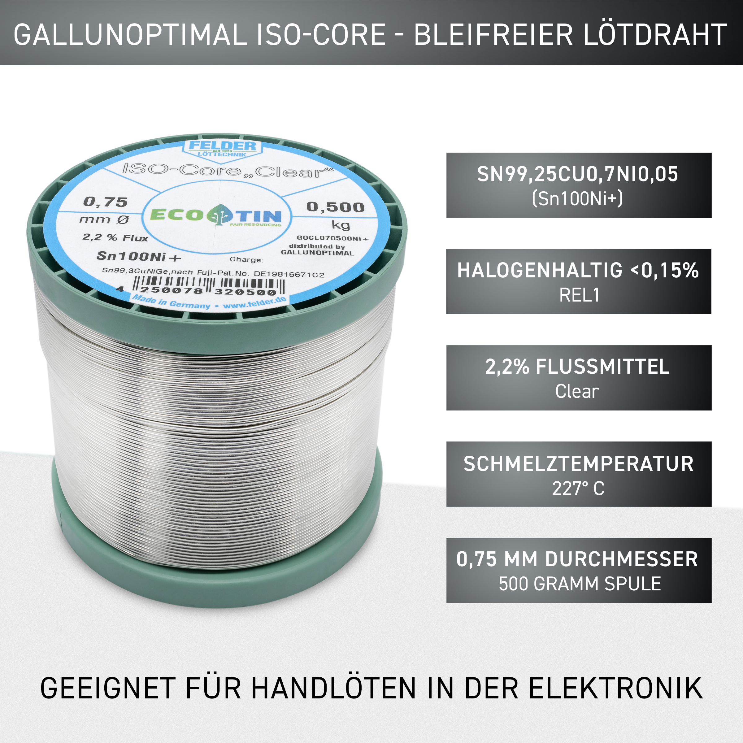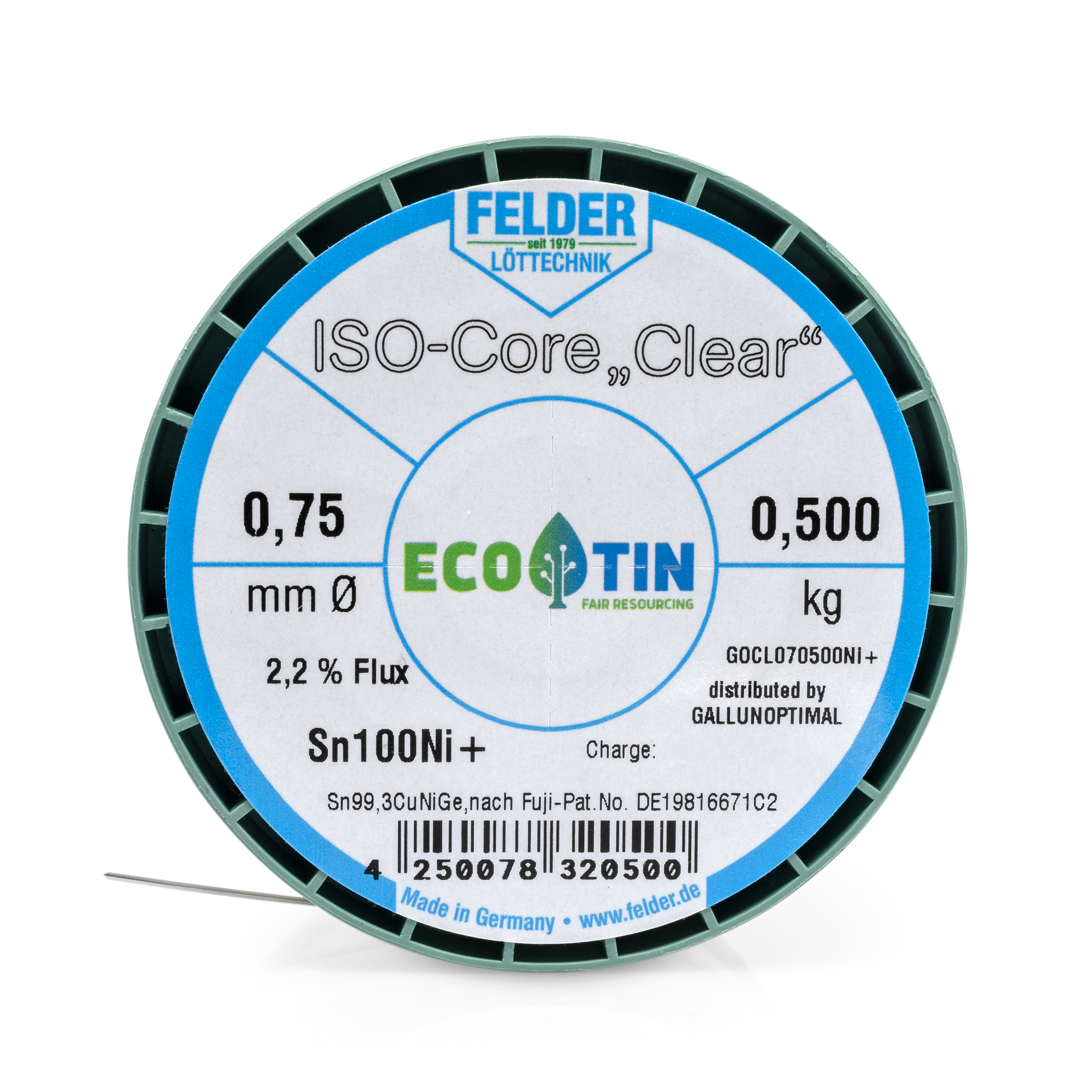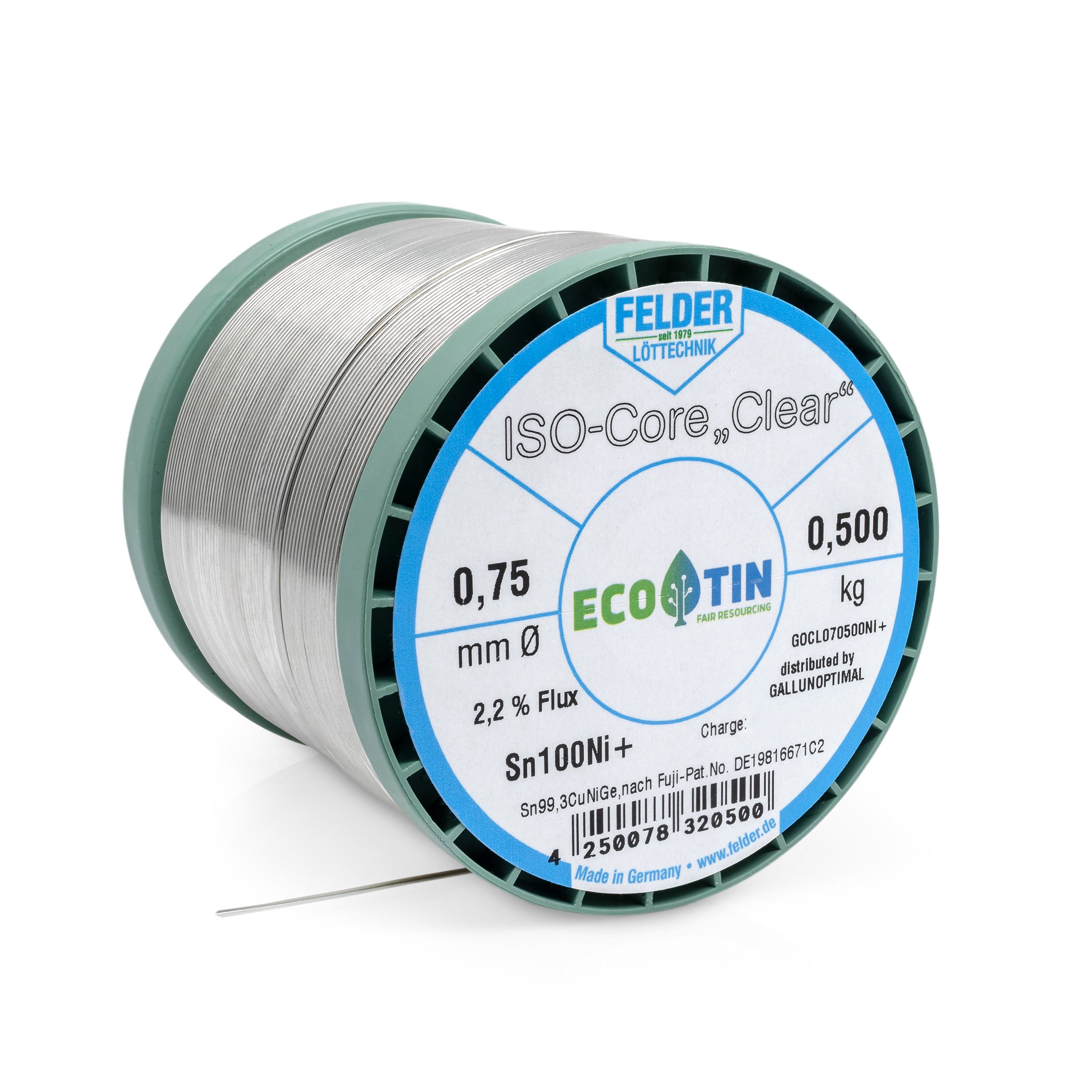 ISO-Core solder wire Sn100Ni+, Sn99.3CuNiGe, according to Fuji patent no. DE19816671C2, melting point 227°C, with 2.2% flux content Clear according to DIN EN 29454/1.1.3.B REL1 (F-SW32) 0.7 mm on 500 g spool