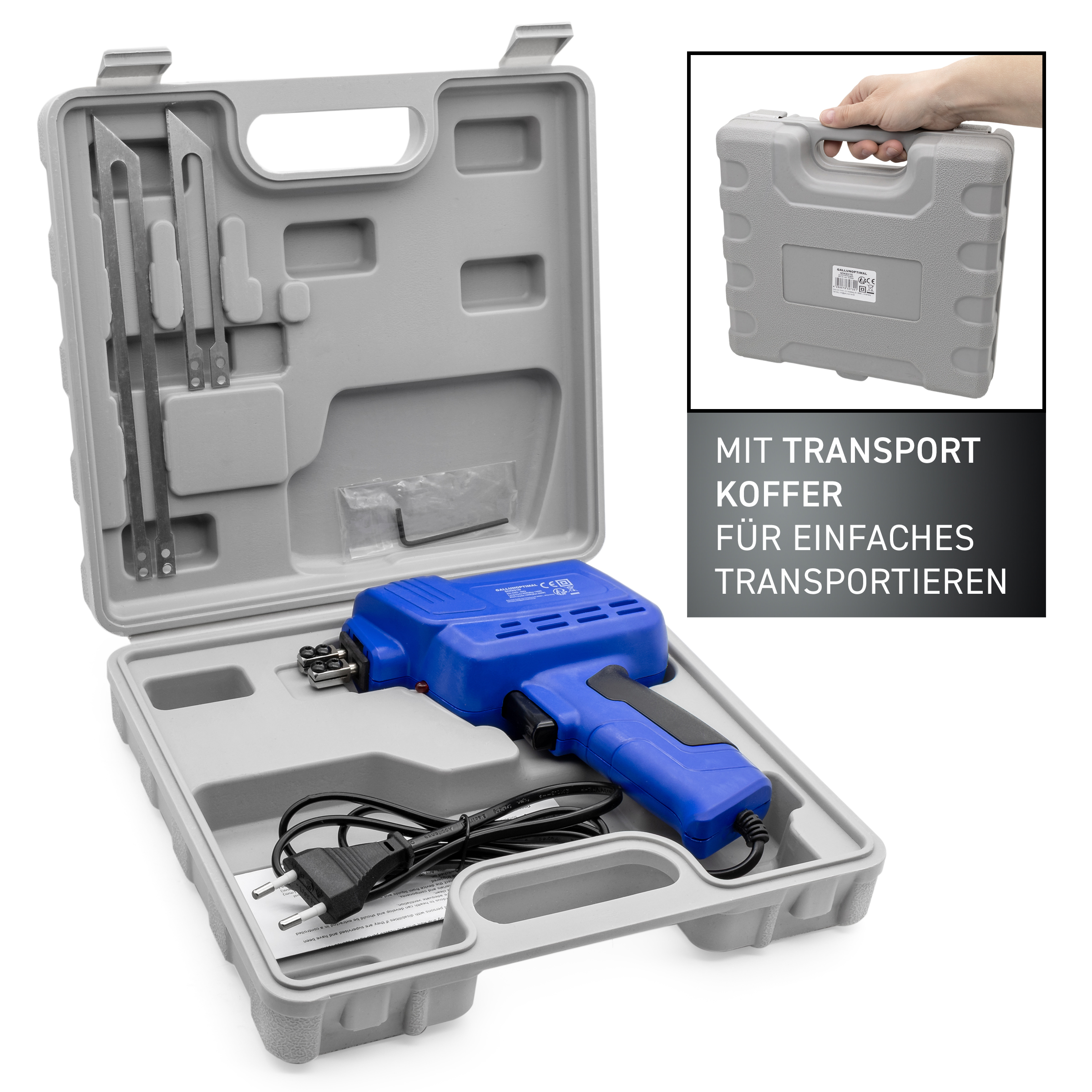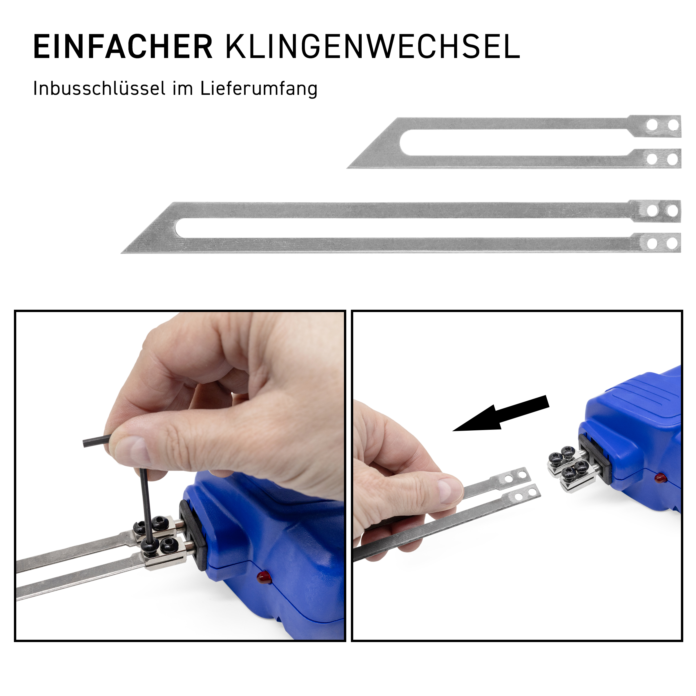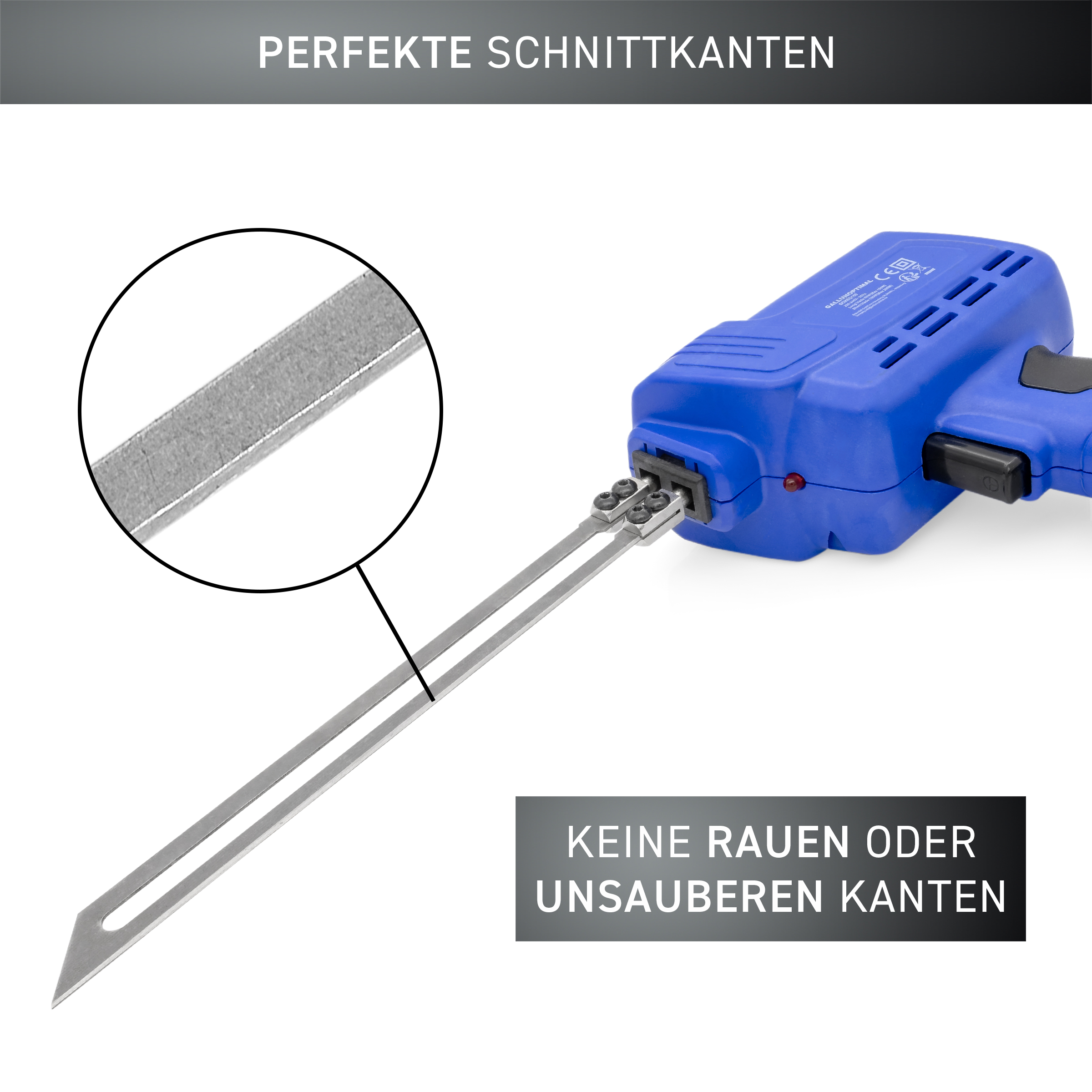 Simple plastic cutting device with 2 interchangeable blades with 105 mm & 185 mm cutting length. The heating time is approx. 10 seconds.
