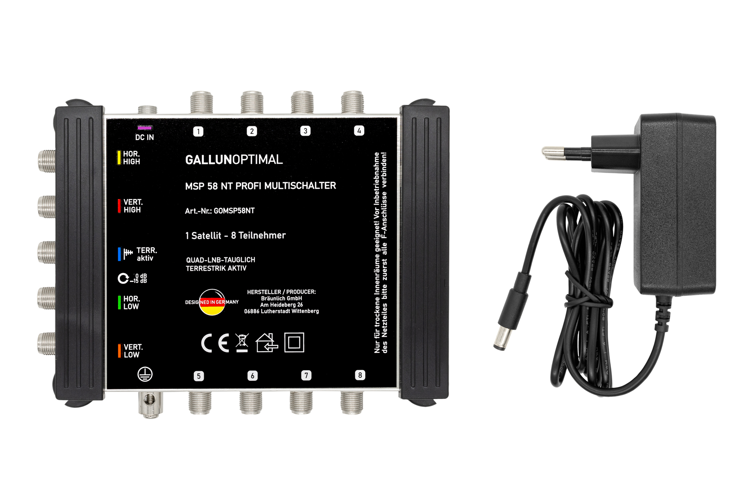 GALLUNOPTIMAL Profi-Multischalter 5in / 8out, terr. aktiv, 15dB regelbar, 22 kHz, Quattro + Quad-LNB tauglich, mit Netzteil 230V