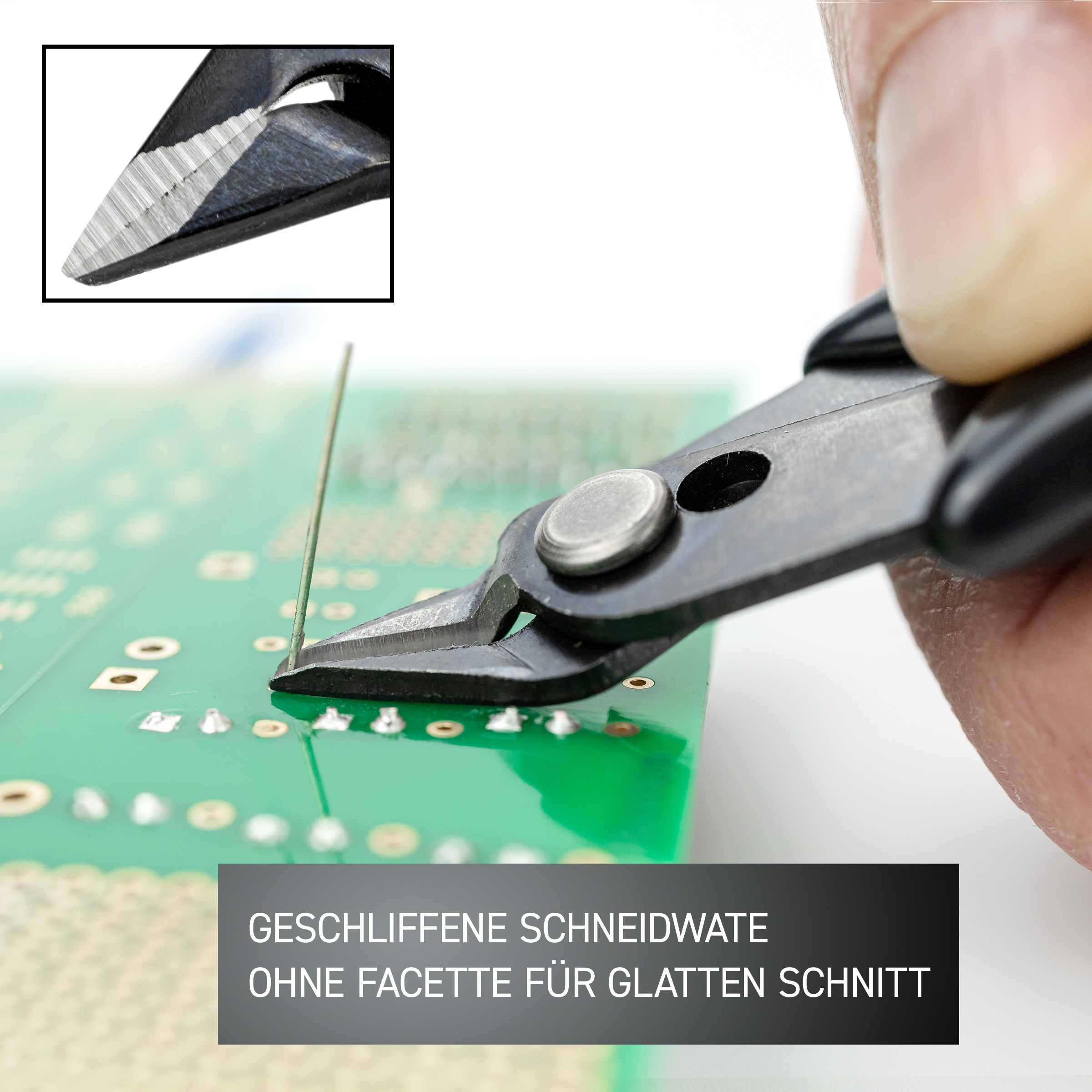 von großer Bedeutung einer Elektronikzange ist die zum Bauteil hingewendete Seite der Schneide. Ist diese glatt, also ohne Wate oder Facette entsteht beim Schneiden kein Druck auf die Lötstelle. Allerdings sind diese Schnittflächen empfindlicher als Schneiden mit einer Wate.