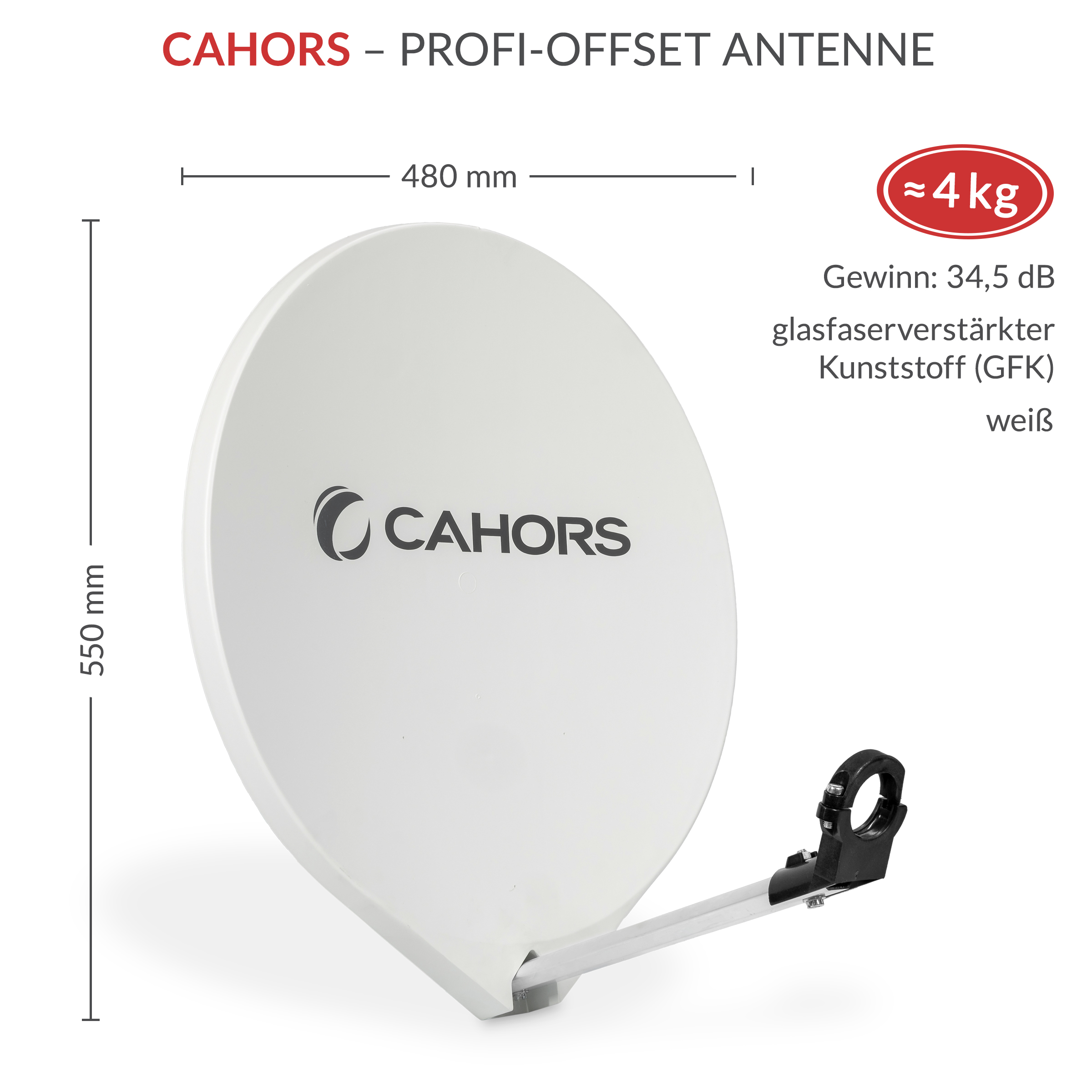 CAHORS 55cm Profi-Offset Antenne, glasfaser verstärkter Kunststoff, 55cm x 48cm, Gewinn: 34,5dB, Gewicht: 4kg, weiß