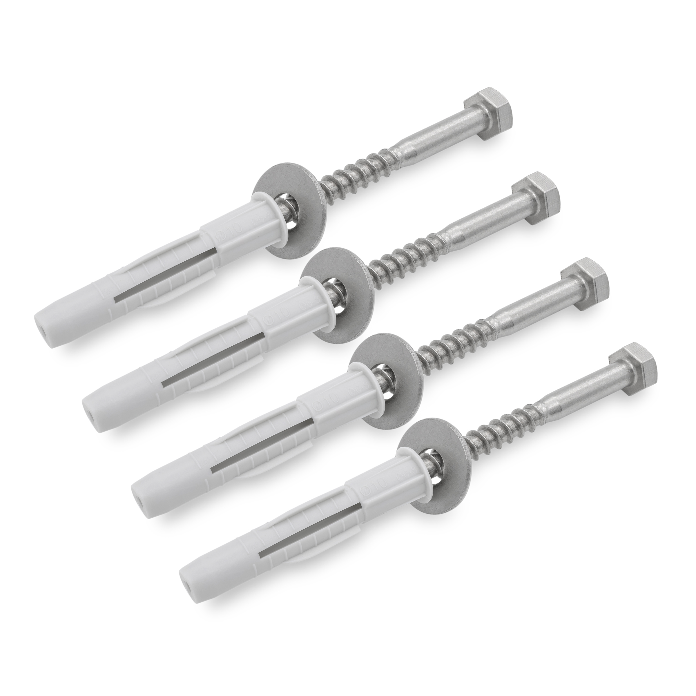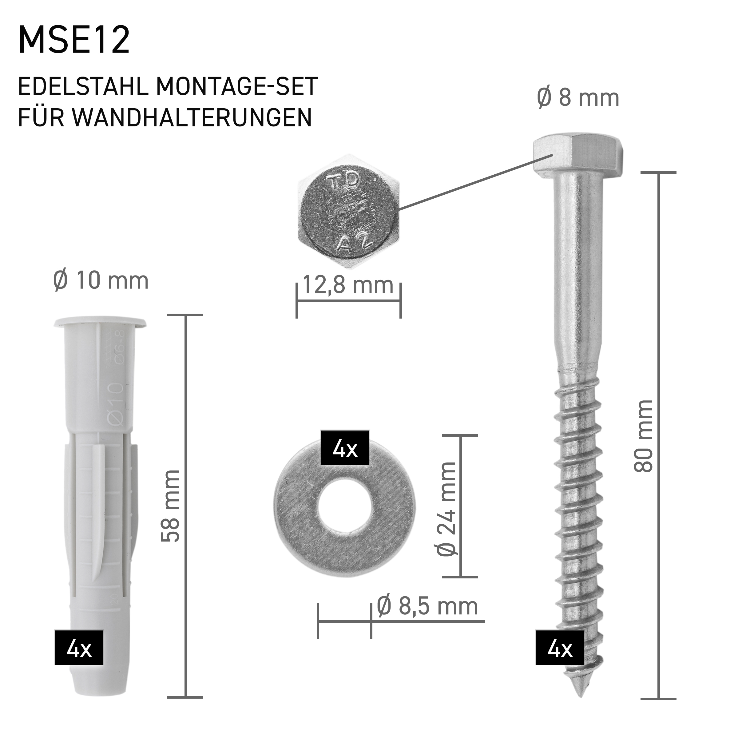 Edelstahl Montage-SET für Wandhalterungen, je 4 Schrauben 8×80, Scheiben, Universaldübel 10×61