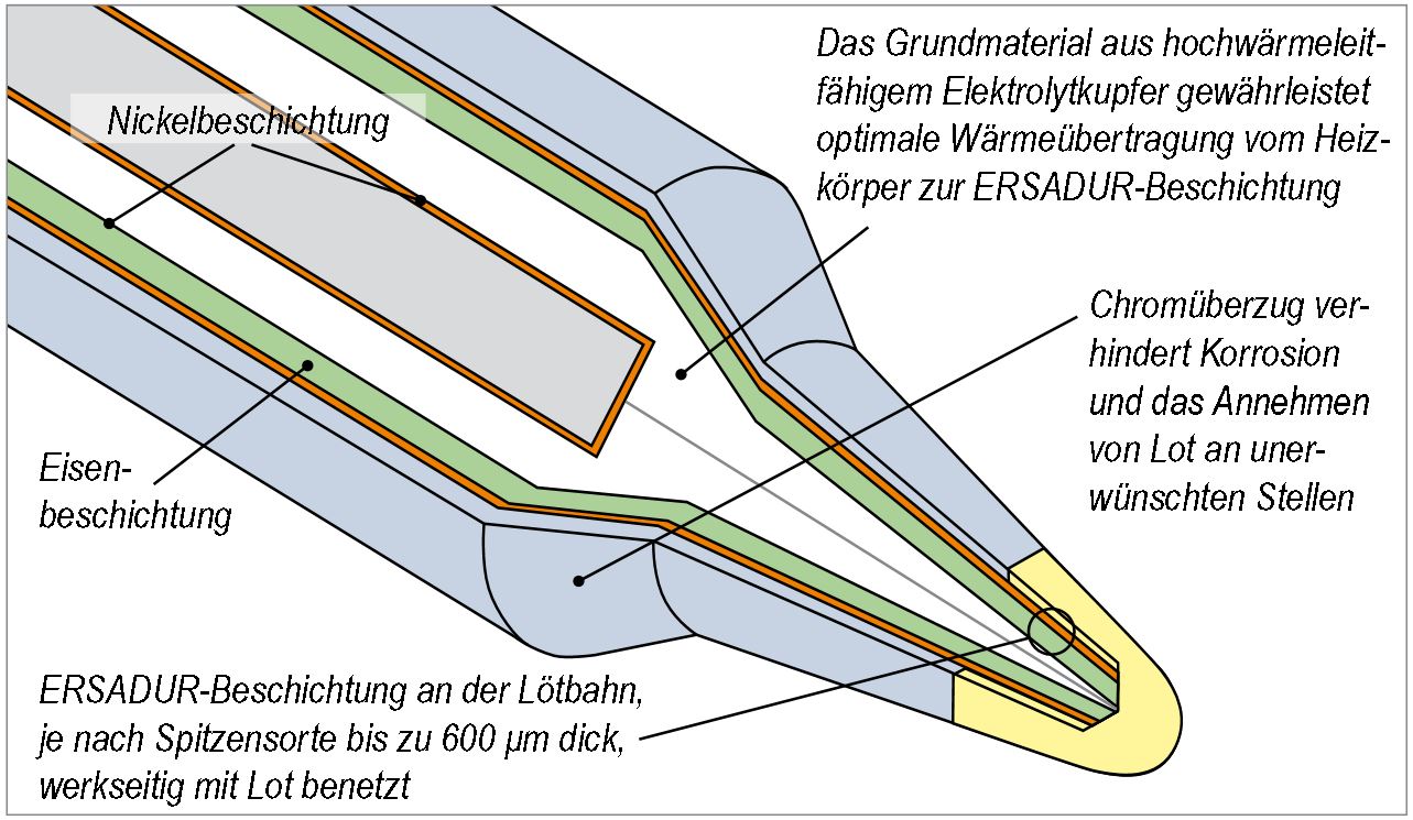 ERSADUR-Lötspitzen sind hochwertig produziert und für den Dauerbetrieb geschaffen. In einem speziellen Verfahren werden sie auf galvanischem Weg mit einer Eisenschicht plattiert und durch eine zusätzliche Chromschicht vor Korrosion und Oxidation geschützt. Perfekter Wärmetransfer schützt den Heizkörper des Lötkolbens vor Überhitzung und vorzeitigem Verschleiß.