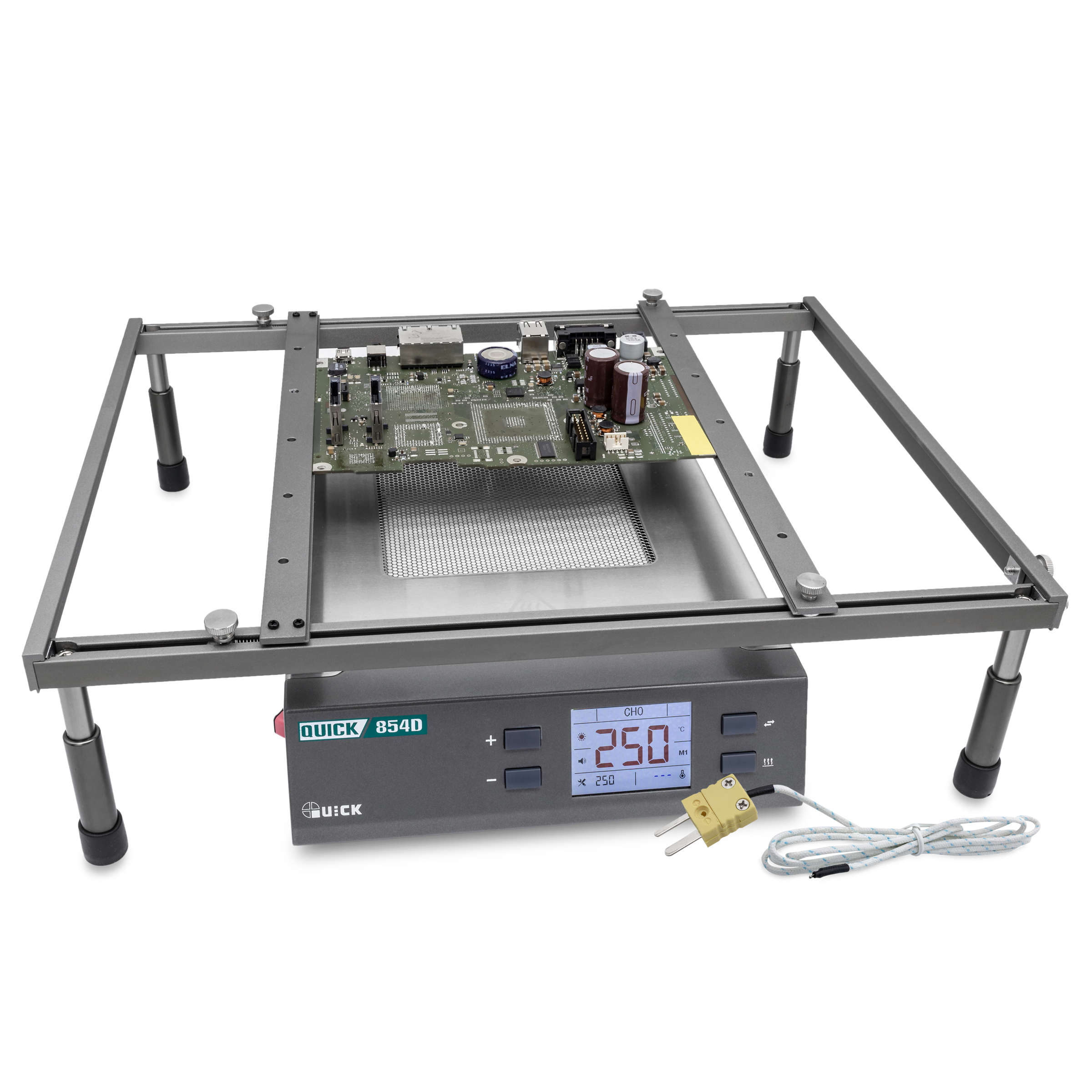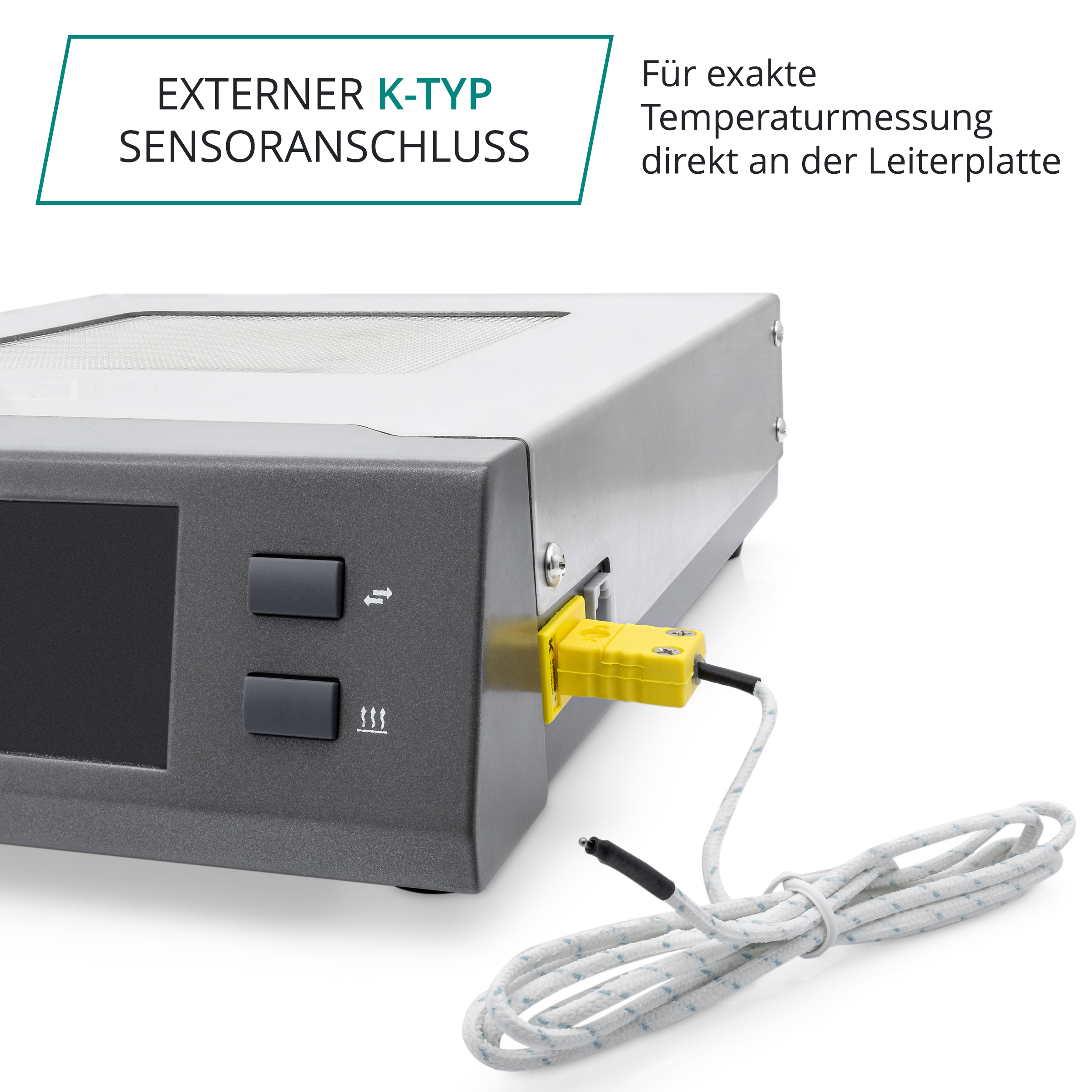 Diese Infrarot-Keramikheizplatte ist die ideale Ergänzung für alle Löt- und Reworkarbeiten, bei denen Leiterplatten kontrolliert vorgewärmt werden sollen. Durch die flächige Erwärmung von unten werden Temperaturspitzen reduziert und empfindliche Bauteile geschont. Das ist besonders hilfreich bei mehrlagigen Boards, großen Masseflächen oder dichten Bestückungen, bei denen ohne Vorheizung schnell hohe Temperaturgradienten entstehen. Für wiederkehrende Aufgaben lassen sich Standardtemperaturen direkt speichern, während ein programmierbares Temperaturprofil reproduzierbare Abläufe ermöglicht – etwa für Vorwärmen, Halten und anschließendes Rework. Zusätzlich kann ein externer K-Typ-Sensor genutzt werden, um die Temperatur direkt an der Leiterplatte zu messen und Prozesse exakt abzustimmen.